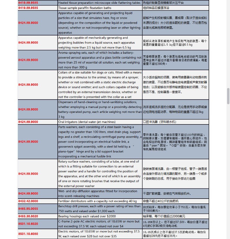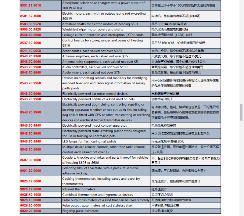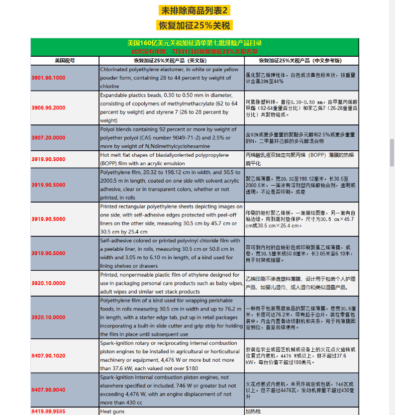 此次没有在排除名单内商品共涉及28个税号下55个品项的商品,恢复加征25%关税,名单如下: