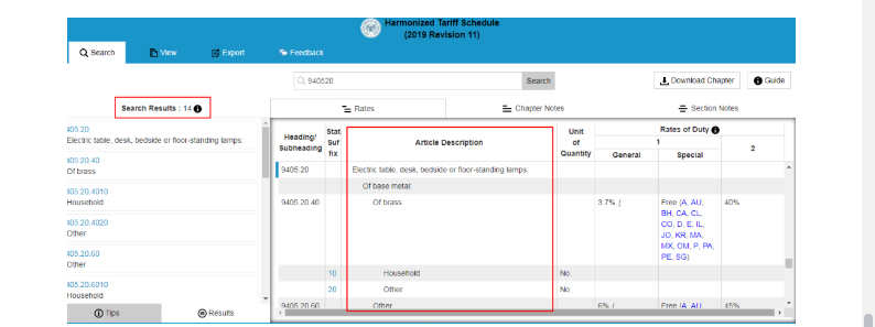 进入上述网站,在搜索框中输入中国HS CODE的前六位数,如台灯940520****,根据产品描述选择准确的HTS CODE。