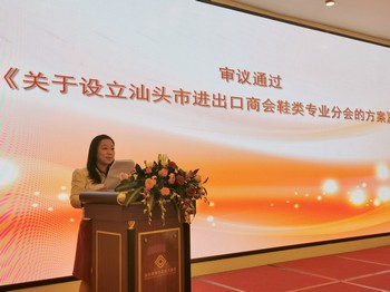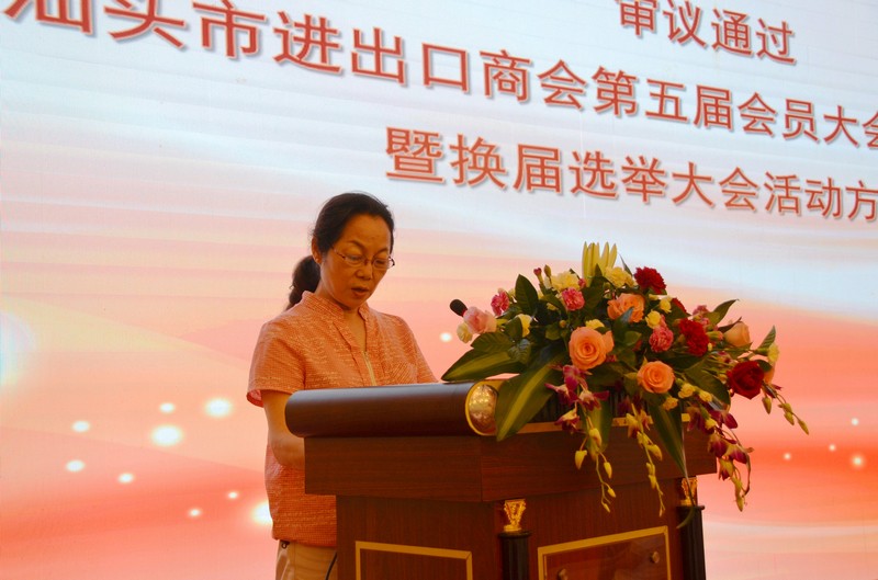 商会换届筹备工作小组组长林梨莉作《汕头市进出口商会第五届会员大会第一次全体会议暨换届选举大会活动方案》