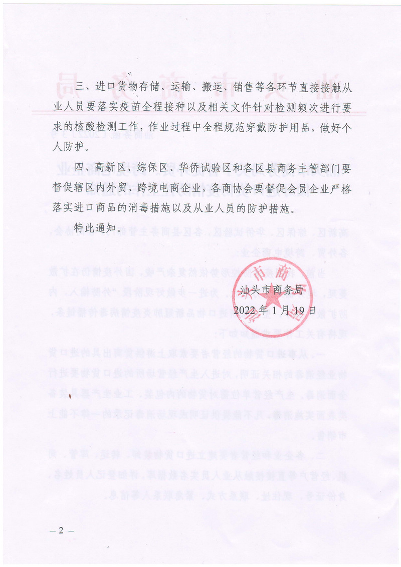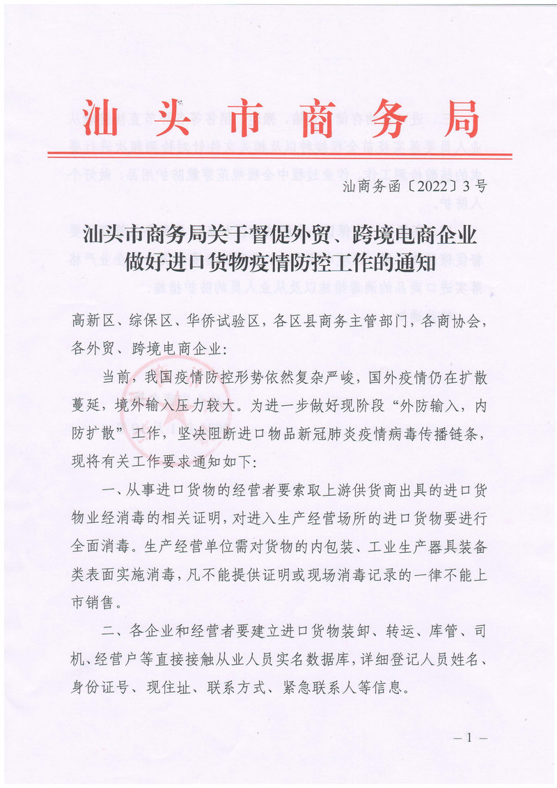 转发汕头市商务局关于督促外贸、跨境电商企业做好进口货物疫情防控工作的通知