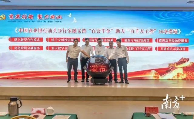 推进会上,农业银行汕头分行《金融支持“百会千企”助力“百千万工程”10条措施》正式发布。农业银行汕头分行将通过建立新型合作模式、给予专项授信额度、打造专属服务体系、创新专项信贷政策、推进新型投融资服务、优化跨境金融服务、加大数字金融赋能、党建引领共建共融、聚力支持“百千万工程”、共建重点示范项目等10条措施,为行业协会及会员企业到县镇村投资兴业提供更多“金融活水”,充分激发县、镇、村发展活力与潜能。