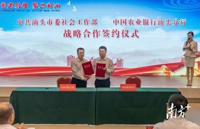 推进会上,汕头市委社会工作部与农业银行汕头分行签订战略合作协议,汕头7个区(县)党委社会工作部与农业银汕头分行辖下7家一级支行签订战略合作协议,农业银行汕头分行发布金融支持“百会千企”助力“百千万工程”10条措施,向10家行业协会商会、10家会员企业进行意向授信。