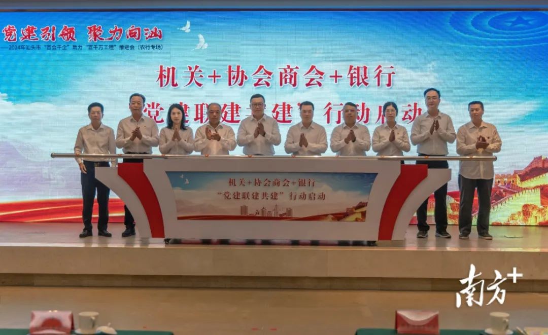 此次推进会启动了机关+协会商会+银行“党建联建共建”行动,汕头市委社会工作部、农业银行汕头分行和有关行业协会商会进行党建联建共建,促进行业协会商会强基础、提实力,更好投身“百千万工程”建设。