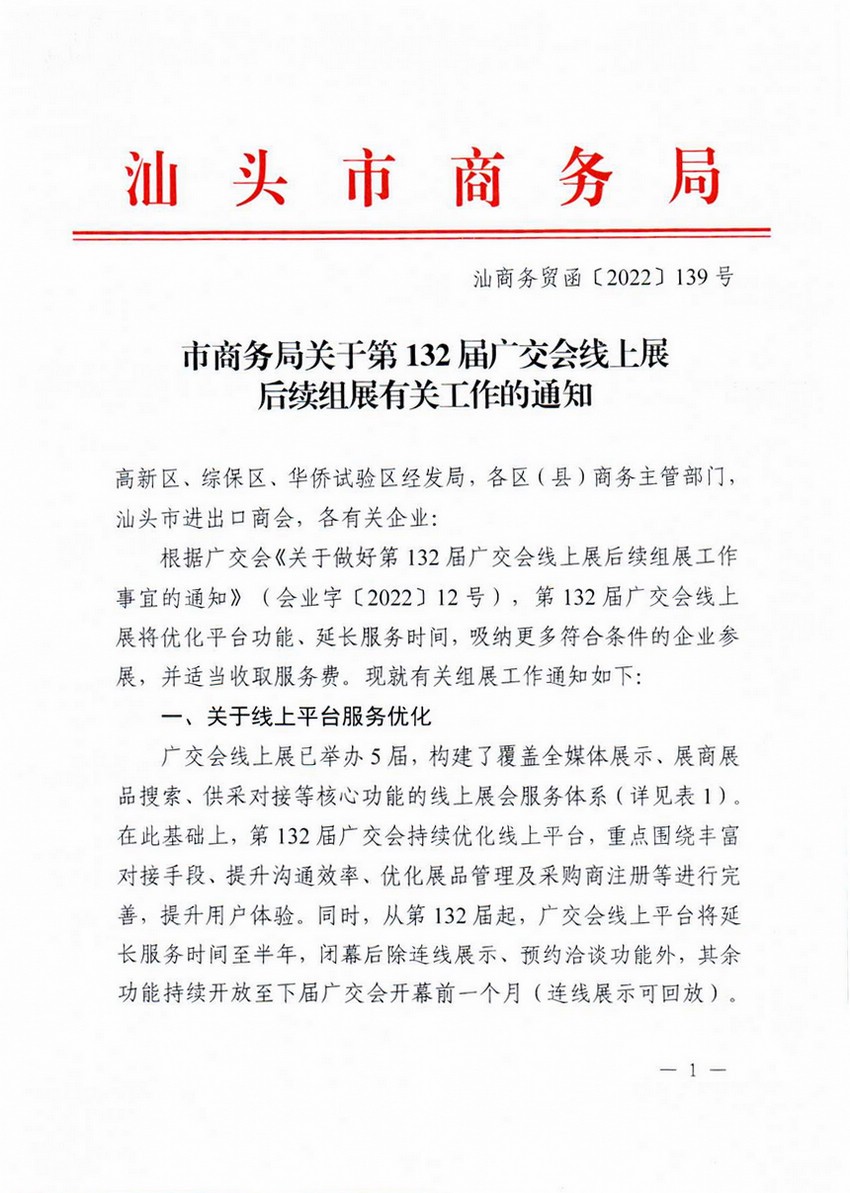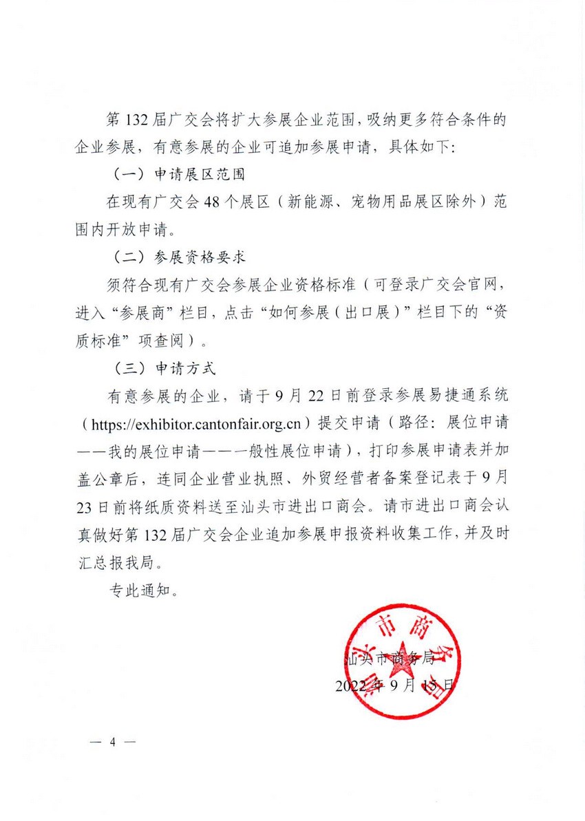 汕头市商务局关于第132届广交会线上展后续组展有关工作的通知