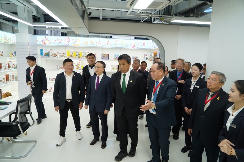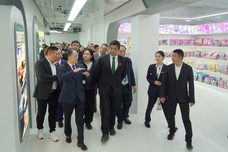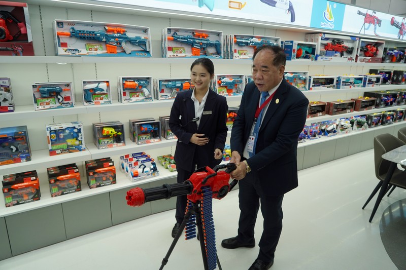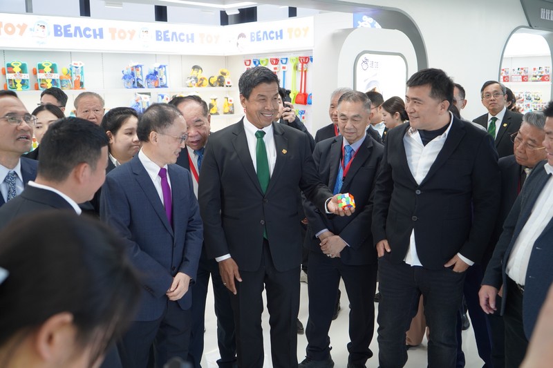 参观交流中,金成峰玩具展厅负责人介绍了玩具展厅的基本情况。该展厅位于汕头市澄海区,面积达数万平方米,是一家集展览展示、产品甄选、源头工厂直供的玩具展示平台,在展的优质源头工厂数百家,展品涵盖了母婴、科教、益智、过家家、遥控等80%的玩具品类,产品种类丰富、认证齐全,是我市玩具产业中较具代表性的供需对接平台。泰国贵宾对玩具展厅展架上布娃娃、遥控飞机、水枪、机器人等各式各样的玩具表示极大兴趣。