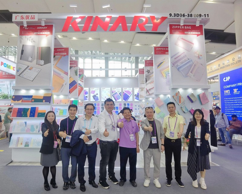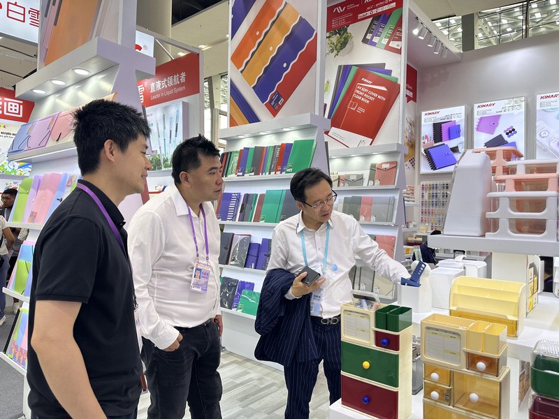 最后大家来到办公文具展区,广东华隆文具有限公司的展位上,色彩鲜艳的文件夹、档案袋、风琴包等数百款办公文具用品整齐陈列,吸引了众多目光。商会常务副会长许木营表示:“文具行业作为传统领域,功能性创新的空间相对有限,但公司研发团队始终保持着敏锐的创新意识。每年,他们都在款式设计、材质选择等方面不断突破,力求为产品注入新的活力。同时,公司也积极践行绿色环保理念,大部分产品均采用回收塑料等再生材料制作而成,既环保又实用。此次广交会,我们特别带来了多巴胺色系的文具收纳柜,其鲜艳的色彩不仅符合文具产品的时尚趋势,更完美契合了本届广交会‘美好生活’的主题。我们希望通过这次展会,吸引更多客户,进一步拓展市场。”
