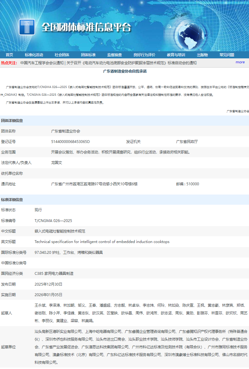 近日,由省制造业协会单位发布,商会常务理事单位汕头高新区德昕实业有限公司发起,汕头市进出口商会、商会会员单位广东睿腾知识产权代理事务所等多家单位联合起草的T/CNGMA026-2025《嵌入式电磁灶智能控制技术规范》团体标准正式发布,发布日期为2025年12月30日。该标准的出台填补了嵌入式电磁灶智能控制领域的技术规范空白,将为行业发展注入强劲动力。