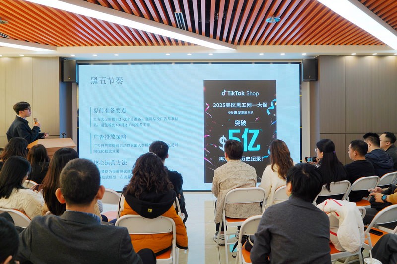 会上,TikTok Shop Partner-Jove全球网红达人机构创始人黄婷婷率先带来干货分享,为参会企业详解TikTok Shop运营核心逻辑。她指出,区别于传统电商平台图片引流的模式,TikTok Shop以五大流量入口相互驱动,重新定义全球电商格局,通过数据驱动实现达人精准筛选与产品内容卖点可视化。同时结合多项实战案例,针对汕头玩具、内衣、陶瓷等优势产业,深度分析其在东南亚、欧美市场的爆品逻辑,并同步平台最新营销活动日历,为企业提供爆款孵化全流程实操指南。TikTok Shop的平台优势与潮汕制造产业带实力的精准对接,让在场企业清晰看到低门槛出海的新可能。随后,TikTokShop全托管官方经理李芷晴、官方广告经理JAY、机构达人总监Kris依次登台,分别围绕TK全托管模式运营、日用消费及玩具类目爆品商机、Gmvmax智能化广告投流技巧、内容营销破局策略等内容展开专业讲解,为企业出海送上全方位实操干货。